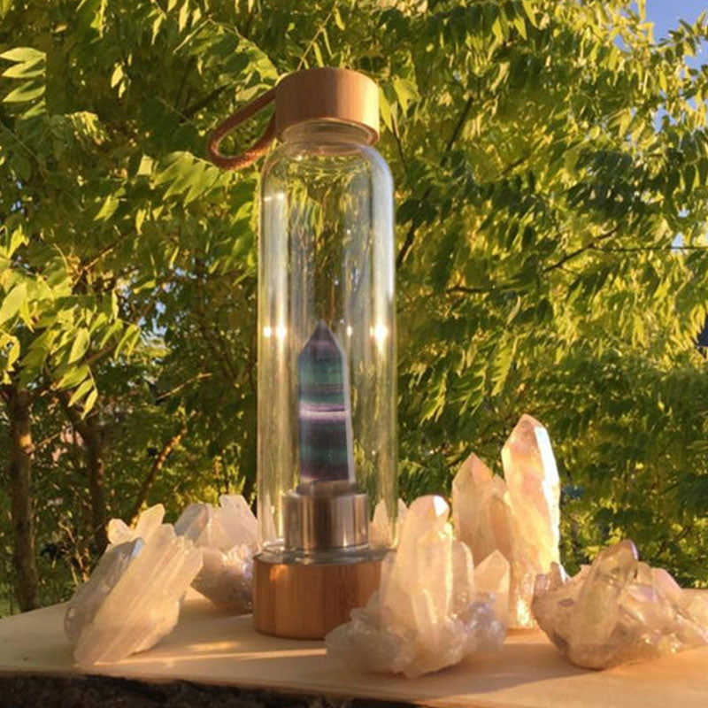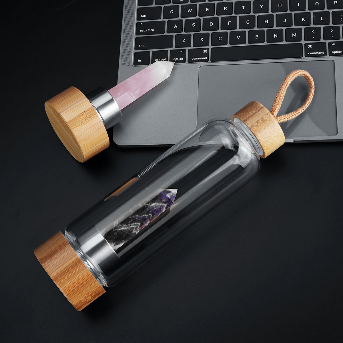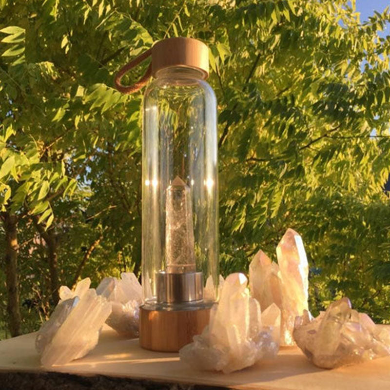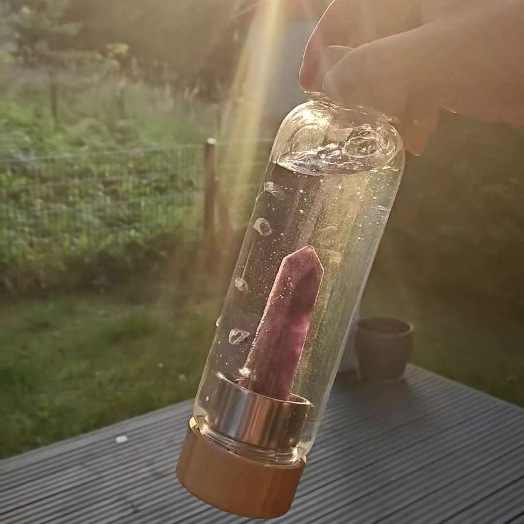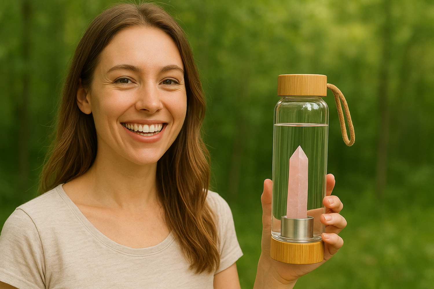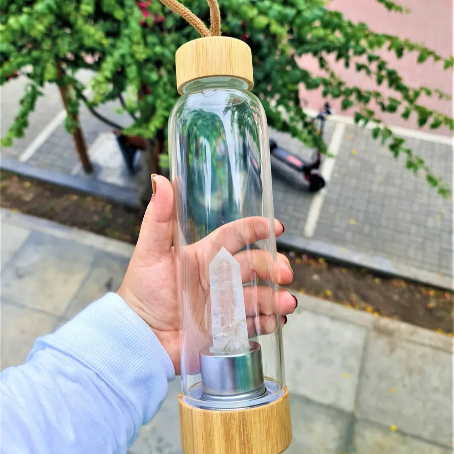 It’s a reusable bamboo and glass water bottle with natural slimming crystals inside, designed to infuse your water with energy that supports hydration, digestion, and natural weight loss.