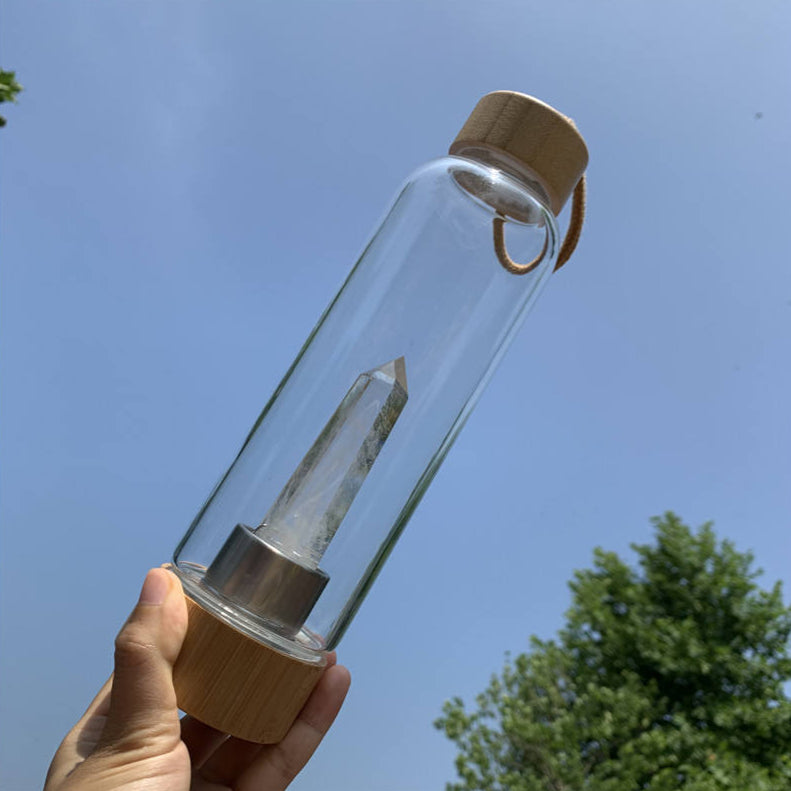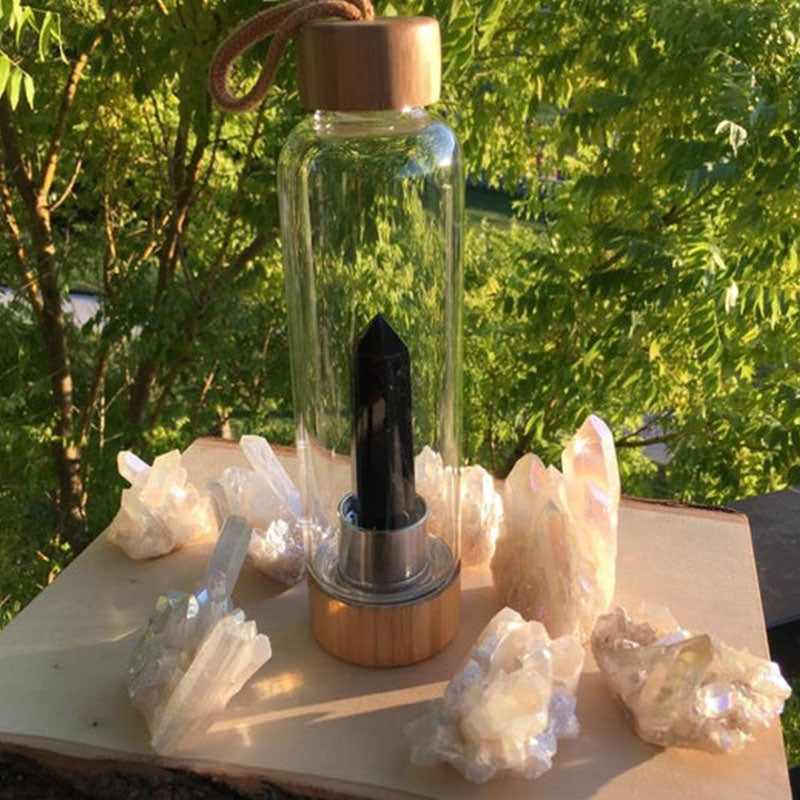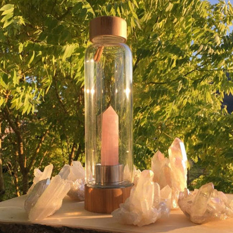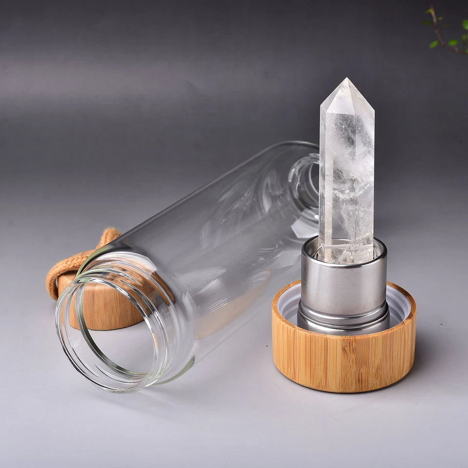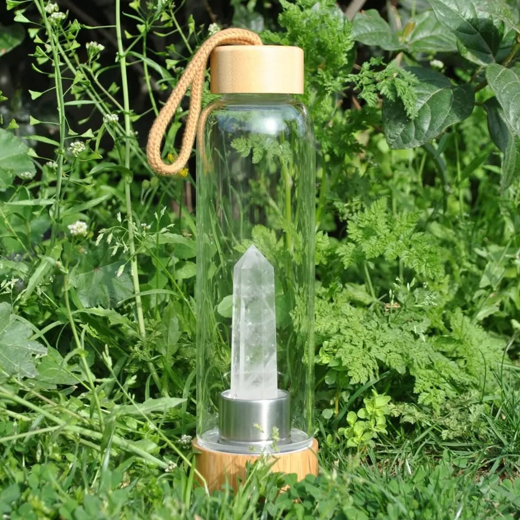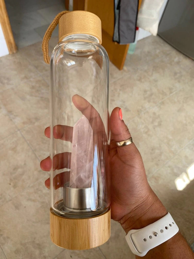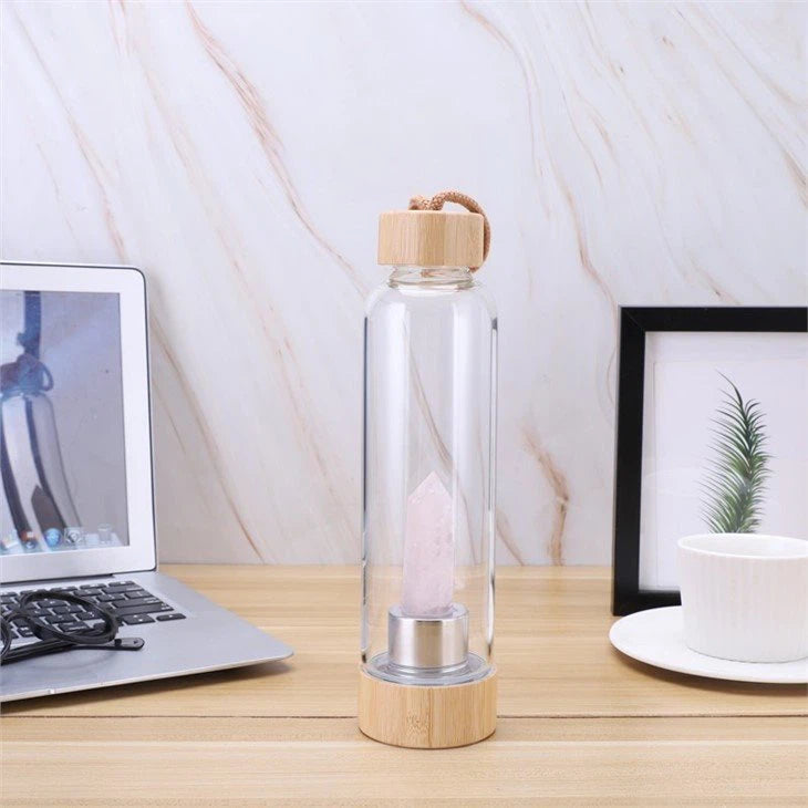 It’s a reusable bamboo and glass water bottle with natural slimming crystals inside, designed to infuse your water with energy that supports hydration, digestion, and natural weight loss.