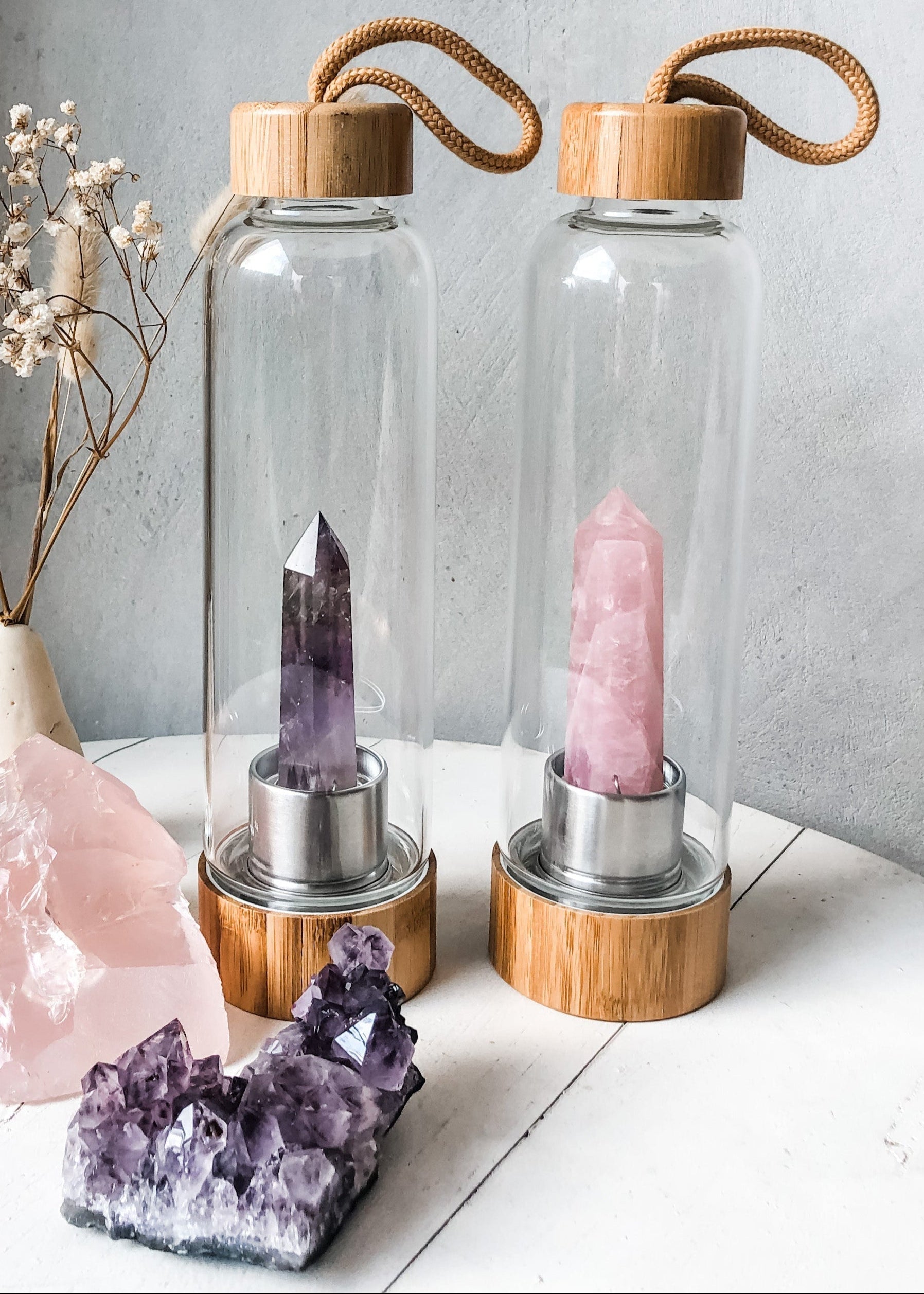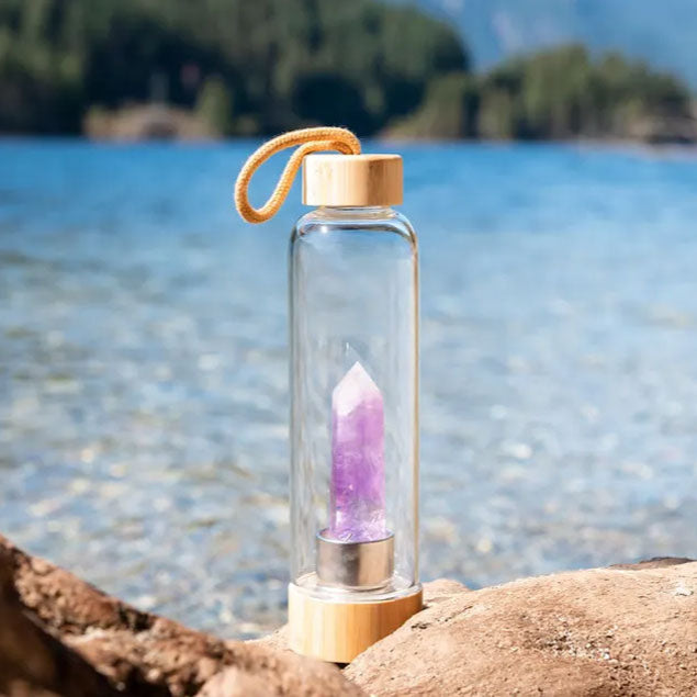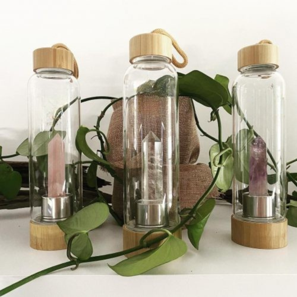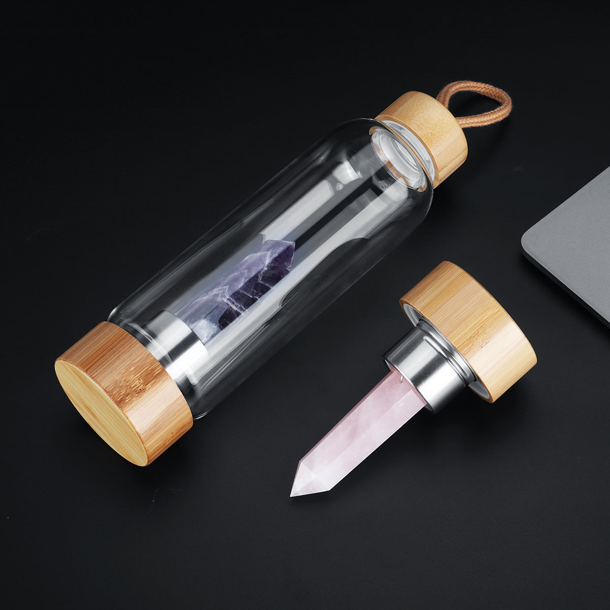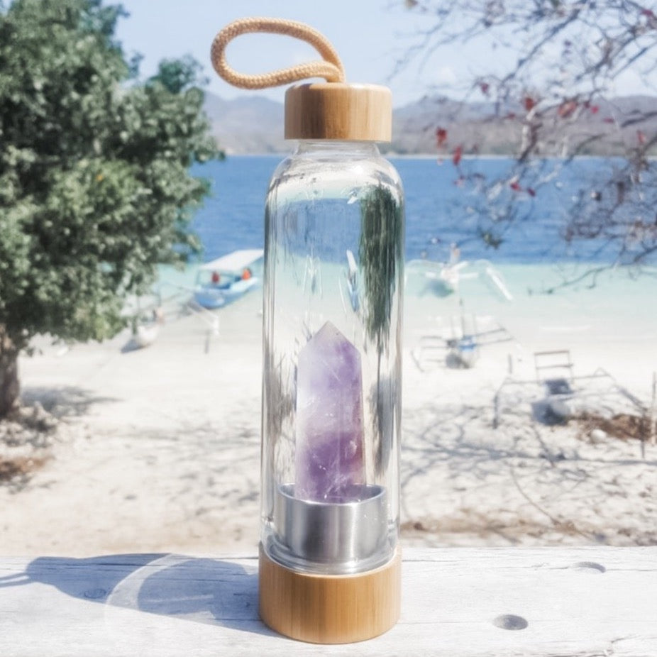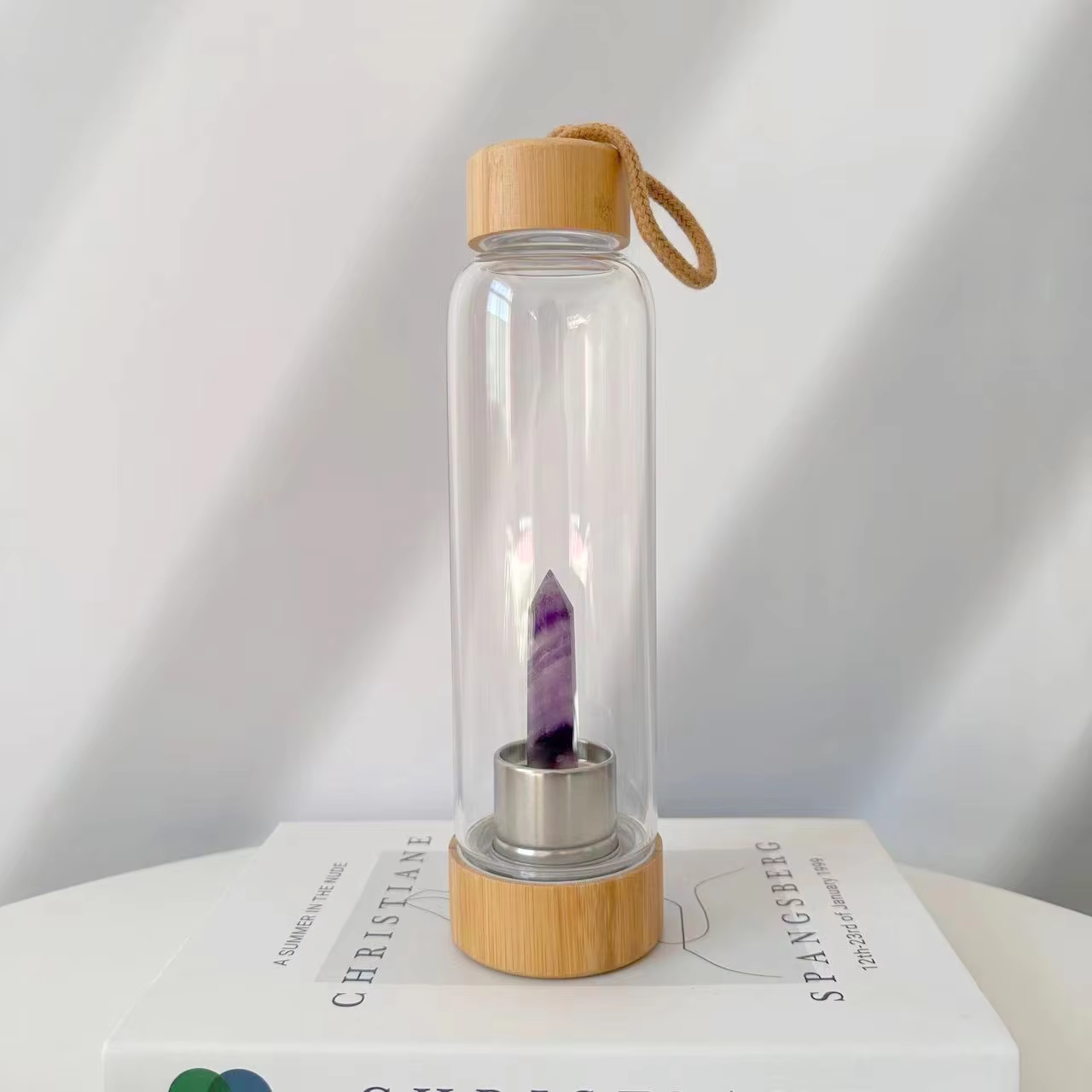 It’s a reusable bamboo and glass water bottle with natural slimming crystals inside, designed to infuse your water with energy that supports hydration, digestion, and natural weight loss.